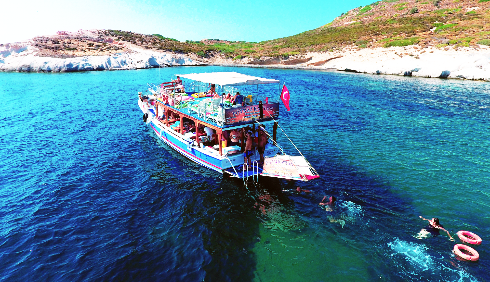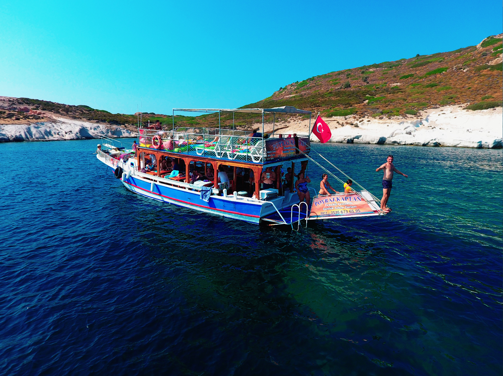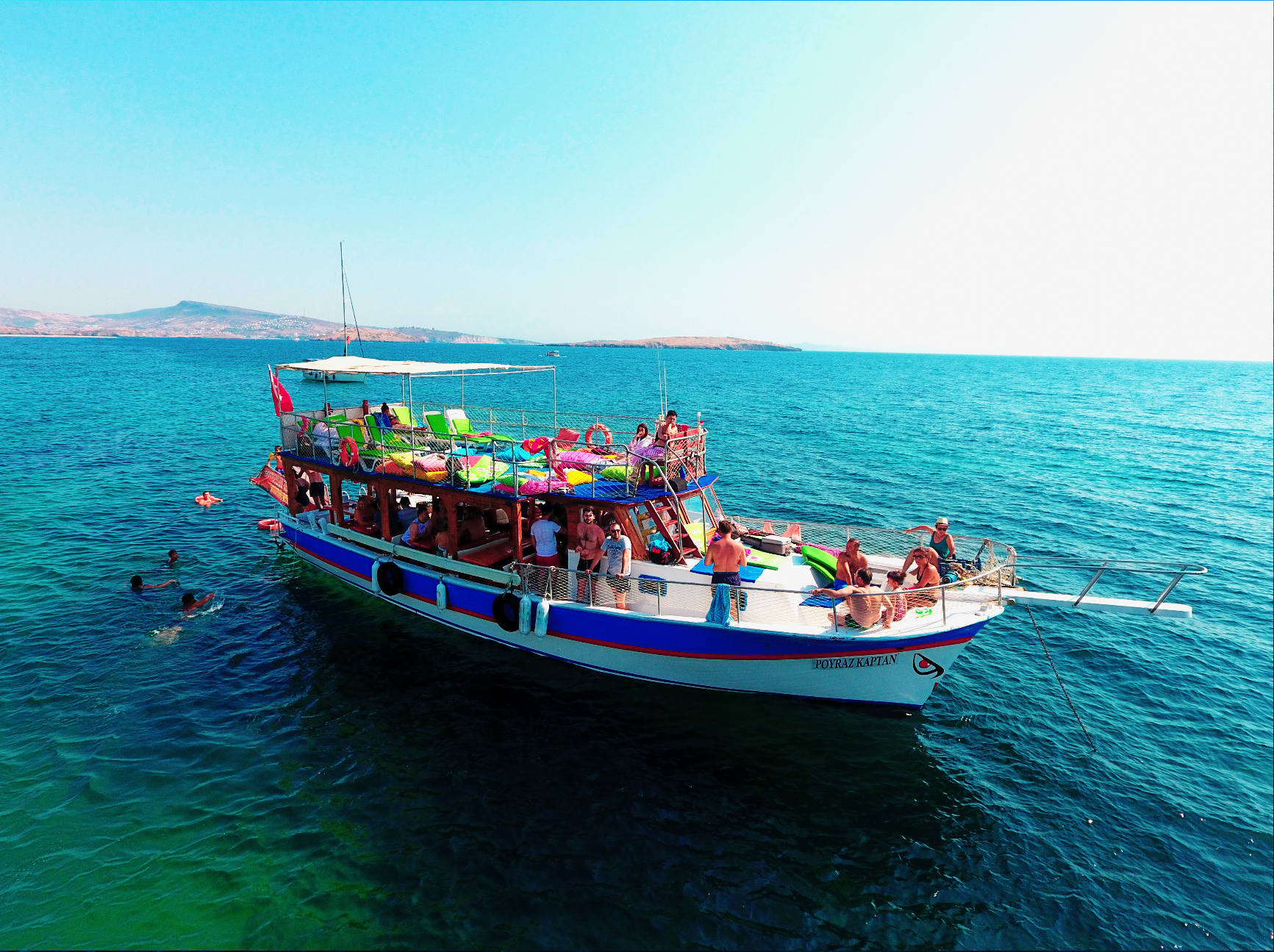 34 kişi kapasiteli Poyraz Kaptan teknesi saat 11:00’da Foça limandan yola çıkıp, güneşlenmek, denize girip eğlenceli saatler geçirmek için her biri eşsiz 4 ayrı koyda mola veriyor.