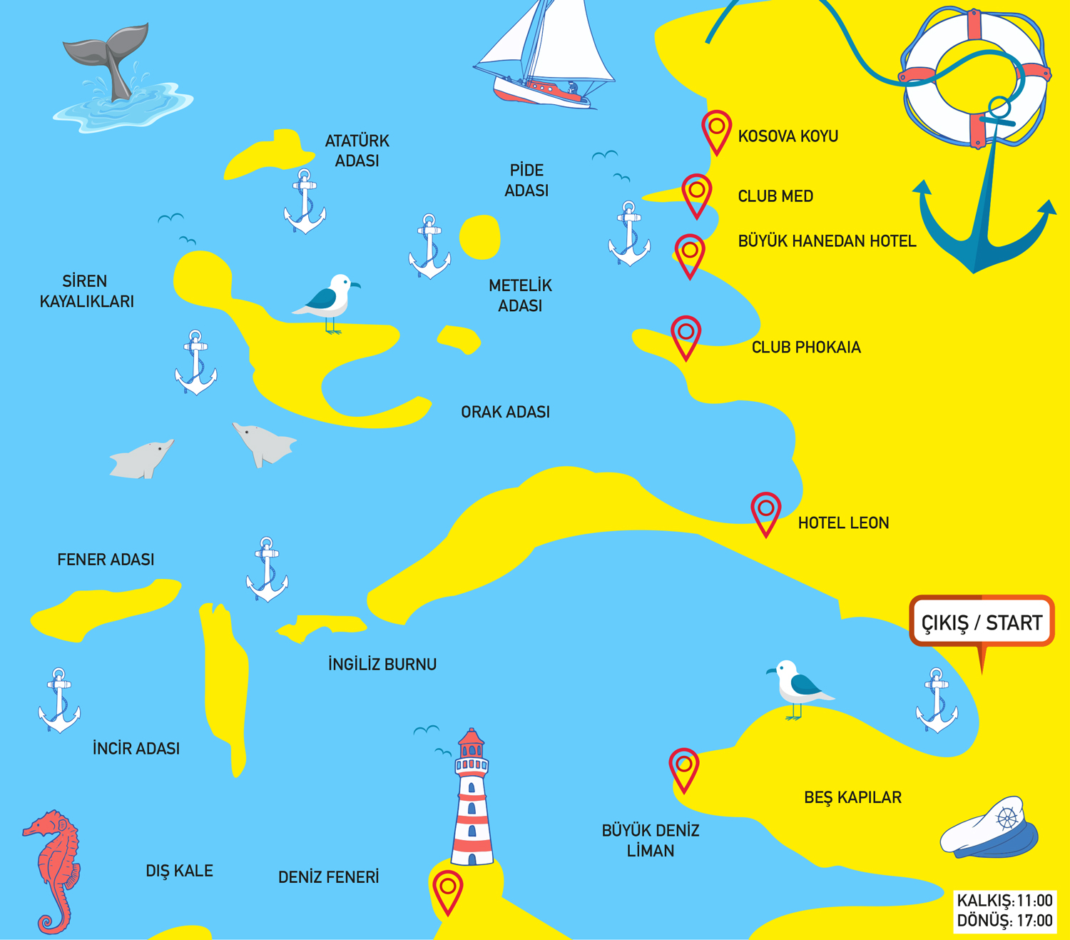 34 kişi kapasiteli Poyraz Kaptan teknesi saat 11:00’da Foça limandan yola çıkıp, güneşlenmek, denize girip eğlenceli saatler geçirmek için her biri eşsiz 4 ayrı koyda mola veriyor.